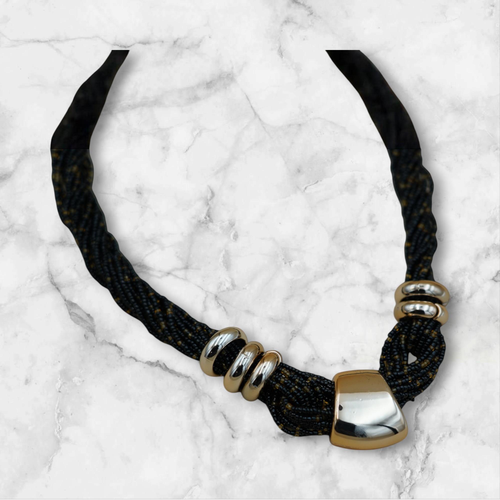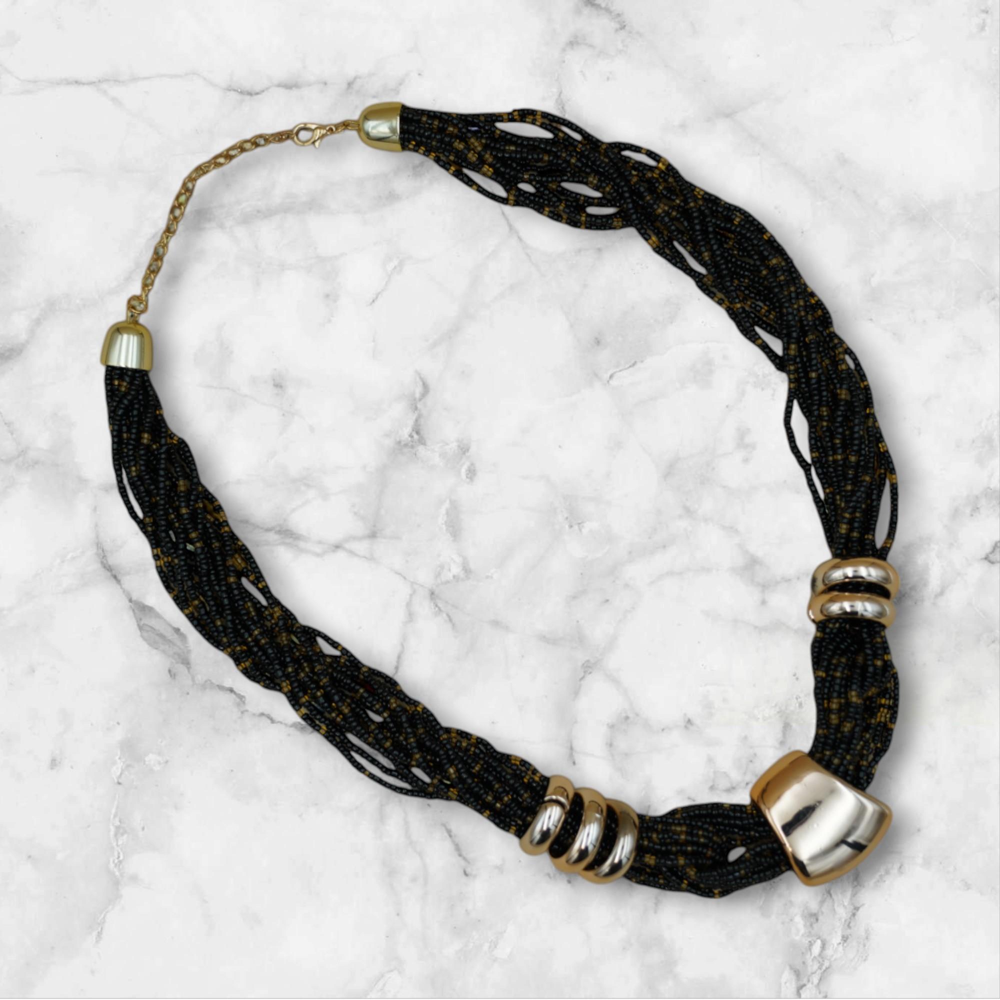 Striking yet refined, the Black Woven Bead Necklace with Polished Gold Accents brings texture and contrast together in perfect harmony.