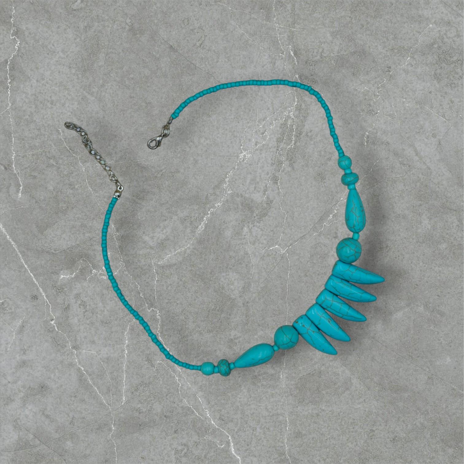 Make a fearless fashion statement with the Turquoise Spike Beaded Choker Necklace, featuring vibrant turquoise beads and a bold tribal-style horn pendant.