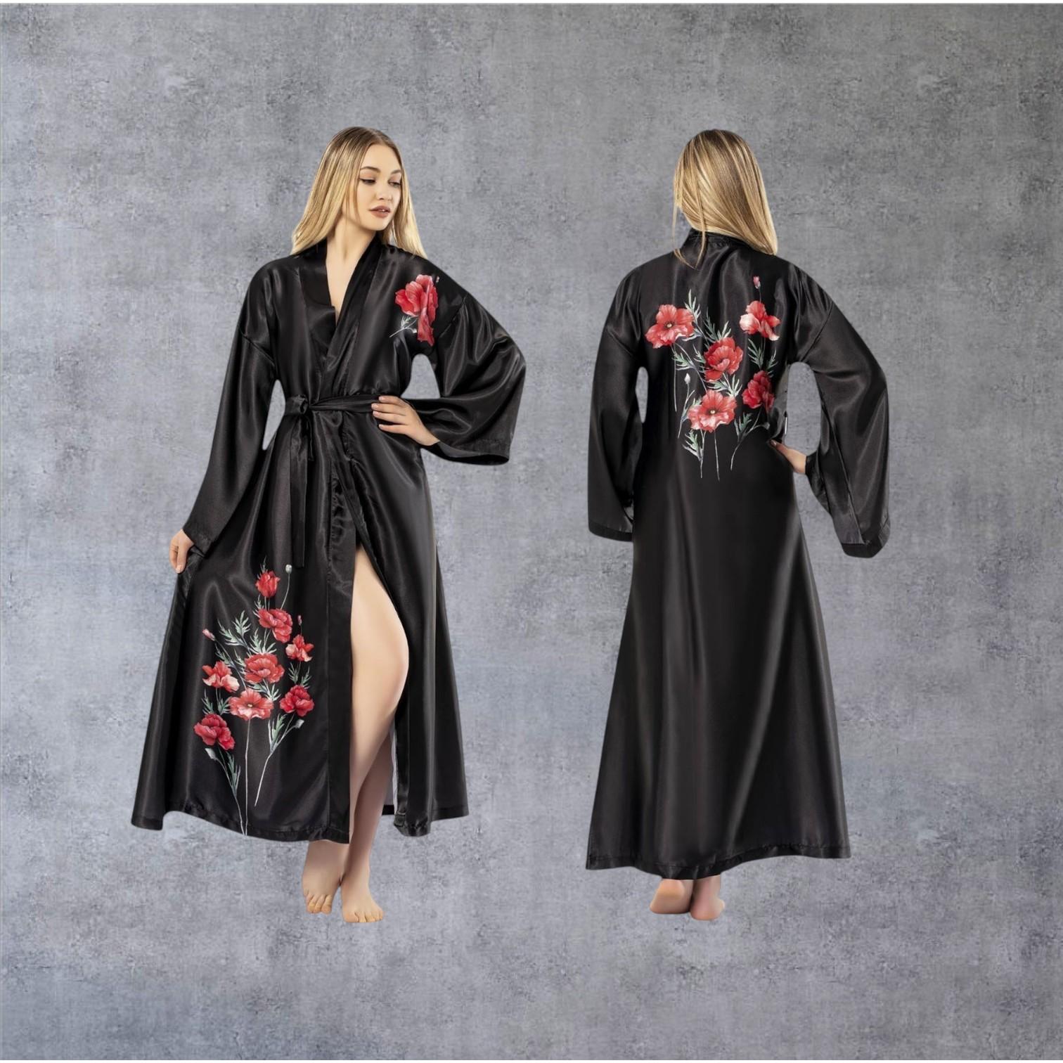 Luxurious silk VIP kimono robe with red rose embroidery. This robe is not just a piece of clothing, but rather a symbol of elegance and luxury. Made from the finest silk to give you an unparalleled soft and smooth feel. It is decorated with delicate and elaborate red rose embroidery, adding a touch of eye-catching beauty. Suitable for those who seek excellence in every detail of their life, and are looking for special moments of comfort and sophistication