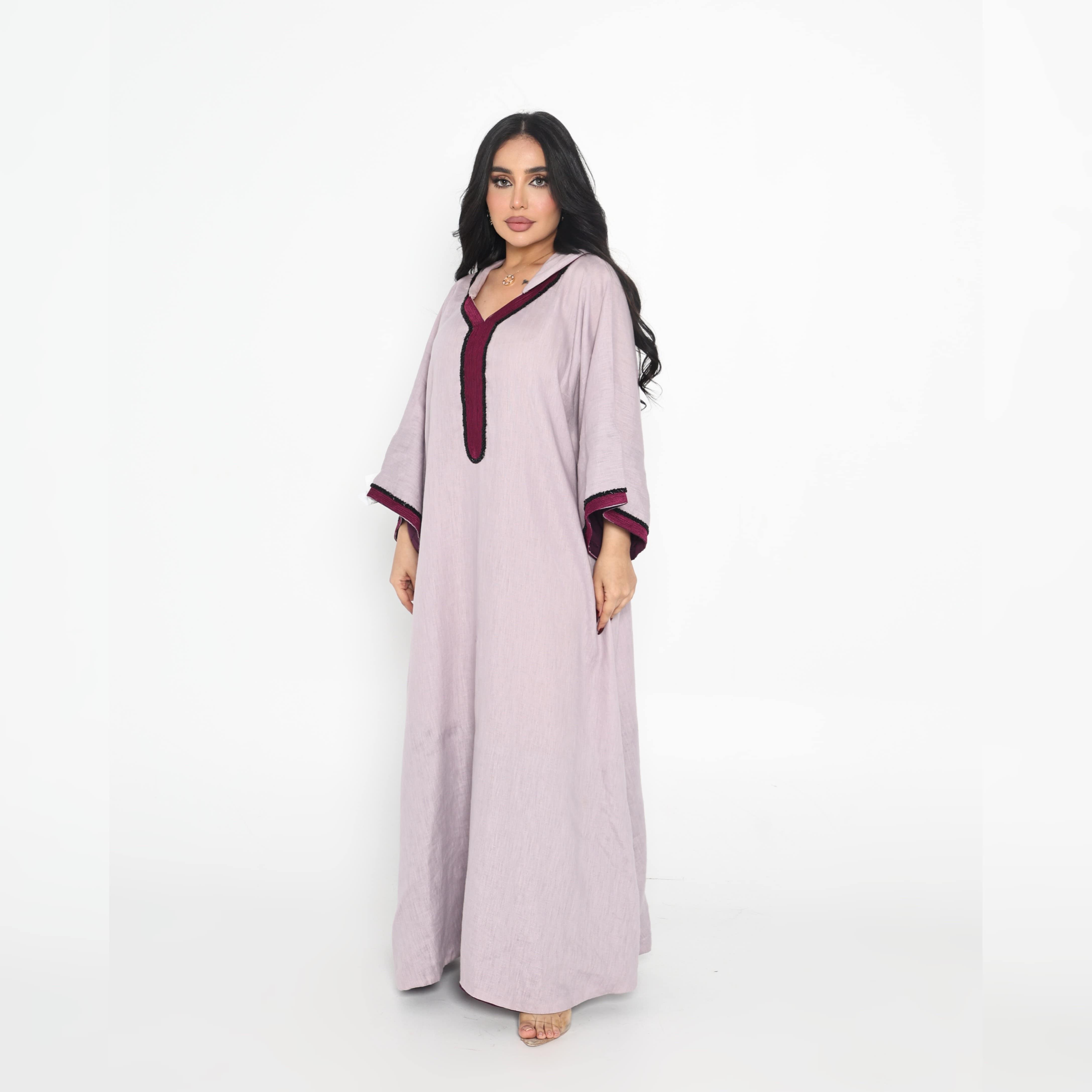 This purple kaftan with contrasting details is a perfect choice for relaxed elegance. A soft, light, flowing piece with a modern touch thanks to contrasting hems. Perfect for wearing at home, as a beach cover-up, or even for casual occasions, as it gives you an attractive look with a simple touch